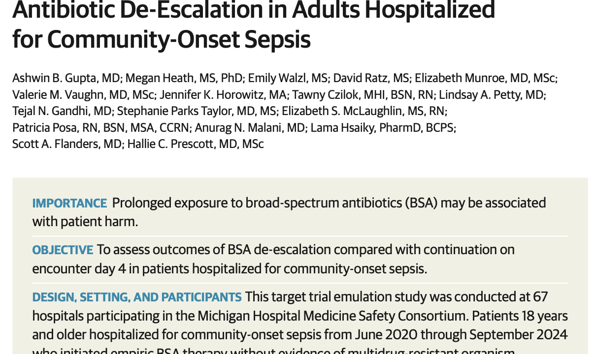 市中発症セプシスにおいて、MDROが検出されない場合の4日目における広域抗菌薬のデエスカレーションは、安全性を損なうことなく、抗菌薬曝露量と入院期間を削減できることが示唆されました。本研究の結果は、適切なタイミングでの抗菌薬の見直しを推奨する現在のガイドラインを支持するものであり、不必要な広域抗菌薬の使用を減らすための重要な根拠となります