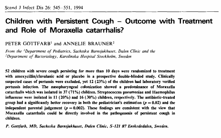 小児の咳が長引くとき、私たちはしばしば「自然に治る経過」と「治療介入の必要性」の間で判断に迷います。本研究は、原因が特定しにくい持続性咳嗽に対して、これまで常在菌と考えられてきたMoraxella catarrhalisに注目し、抗菌薬治療が臨床経過にどのような影響を与えるのかを検討したものです。日常診療の悩ましい問いに、実証的な視点から迫った研究といえます。