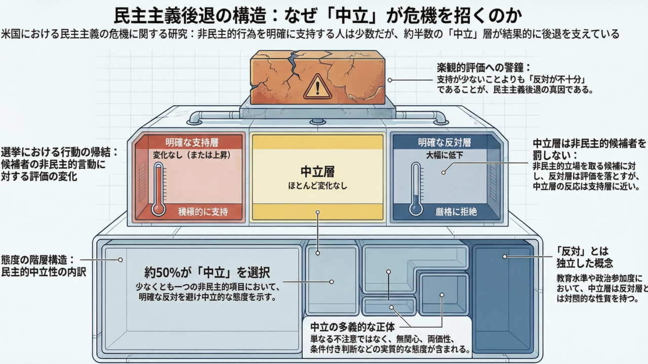 本研究は、このギャップの説明として「賛成でも反対でもない」中立層に着目する。三つの調査データを用いた分析により、非民主的行為への明確な支持者は少数にとどまる一方で、中立的態度を示す人はそれを上回り、約半数が少なくとも一つの項目で中立を選択していることが示される。また、この中立は単なる不注意ではなく、不確実性、無関心、両価性、条件付き判断、社会的望ましさといった複数の意味を内包する実質的な態度であると解釈される。