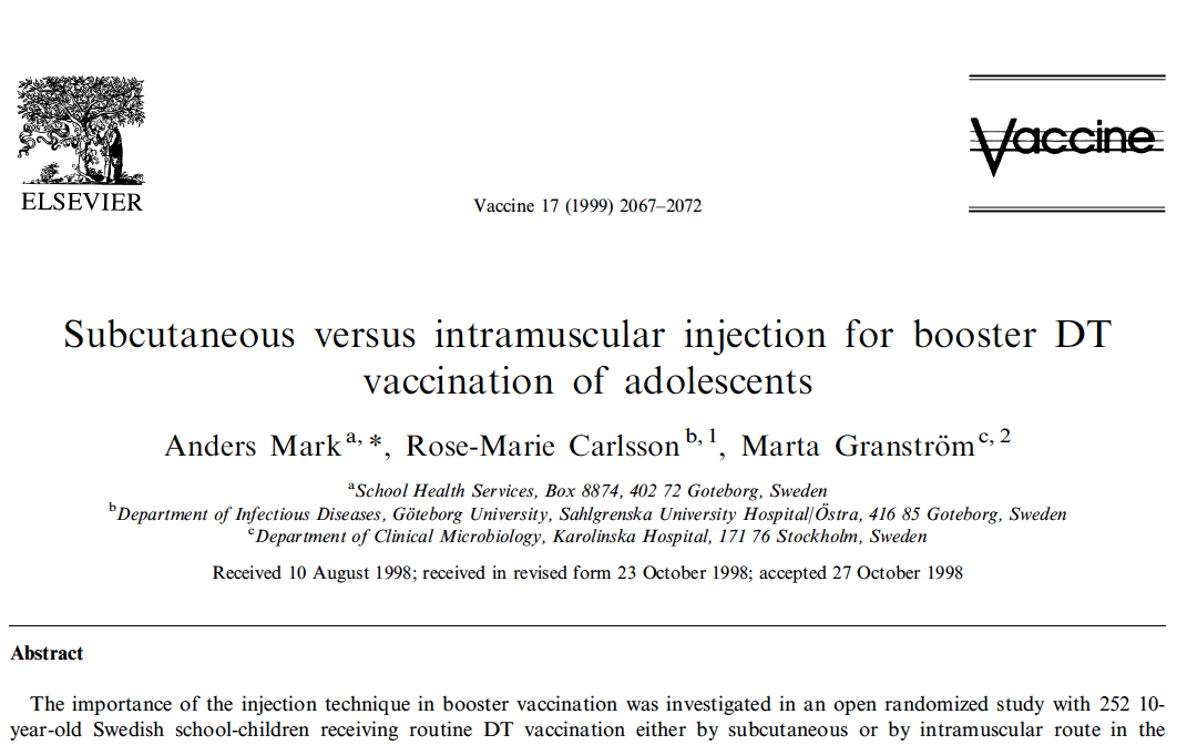 Mark A, Carlsson RM, Granström M. Subcutaneous versus intramuscular injection for booster DT vaccination of adolescents. Vaccine. 1999 Apr 9;17(15-16):2067-72.