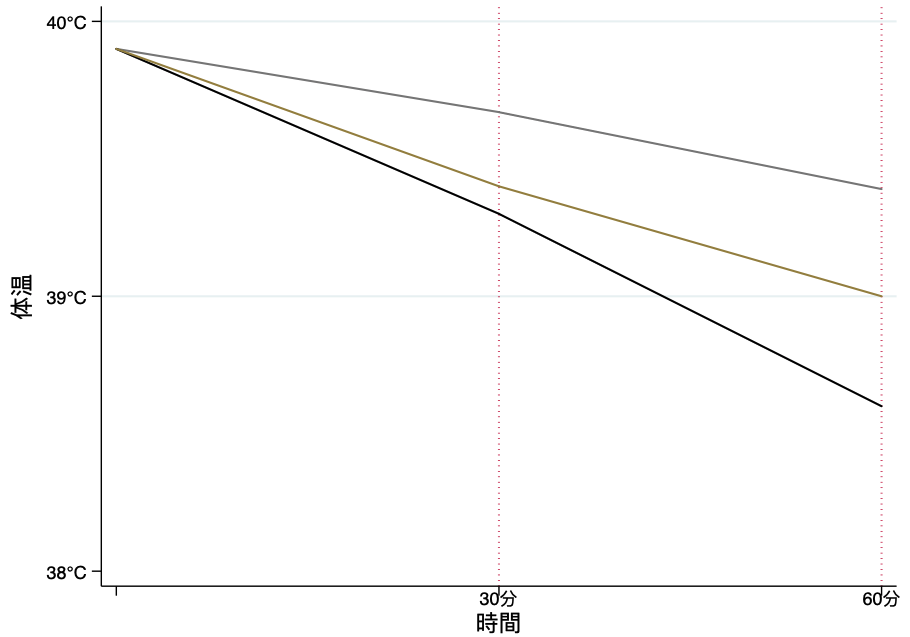 60分というやや短い時間ですが、スポンジのみより解熱薬を使用した方が体温は下がりそうな印象です。